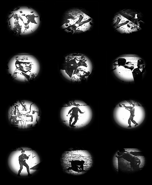 Presenta una imagen extraída de un titular del diario EL ESPACIO en Colombia, en noviembre de 1985 durante la toma del Palacio de Justicia por parte del grupo guerrillero M19, el titular dice “Palomas” y da paso a un articulo sobre el vuelo y estadia de las palomas durante los días de guerra en la capital colombiana, la otra proyección da cuenta de los agentes de la ley, militares, policía con uniforme y de civil, que participaron en la retoma a sangre y fuego del Palacio las imagen son puestas a través de un ojo que a manera de testigo da cuenta de su presencia en este episodio de la historia violenta de Colombia.